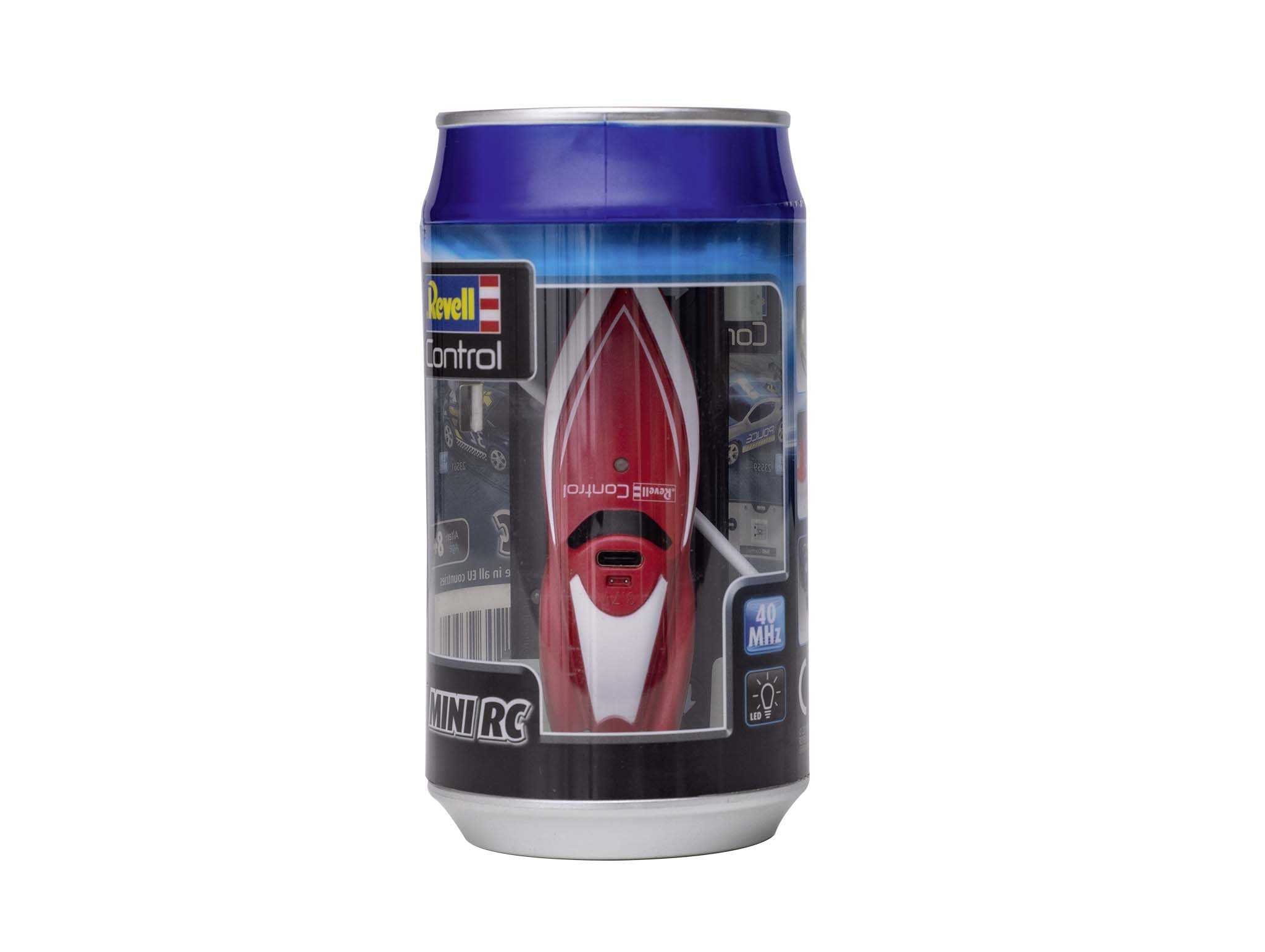 RC mini člun s 2,4 GHz dálkovým ovládáním v plechovkovém balení. Velikost: 7,5 cm.